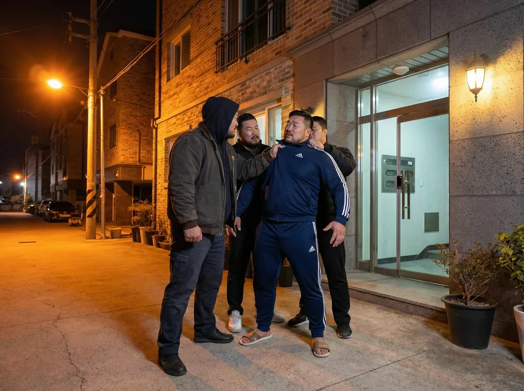 건장한 사내 셋이 몰려와 누군가를 벽에 밀어붙인 채 멱살을 쥐고 있었다. 엮이면 골치 아프겠다 싶어 발길을 돌리려던 순간, 가로등 불빛 아래로 드러난 사내의 얼굴이 눈에 들어왔다. 아침에 봤던 그 늘어난 아디다스 저지. 강병운이었다.