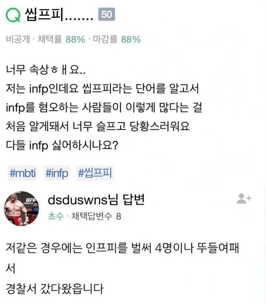 질문익명다들 mbti가 어떻게 돼?익명_bee1eb17약 4시간 전난 isfp고선호하는 mbti는 isfj enfj esfj임좀 꺼리는 mbti는 대문자T랑 infj요즘 infp가 정병 멘헤라 대표 mbti로 인식 박혀서 씹프피라고 조리돌림 많이 당하던데 일단 그래도 estj entj intj 이런애들보다는 100배 나은듯좋아요