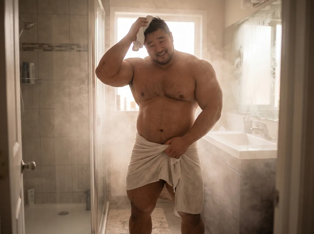 수건 한 장으로 대충 머리를 털며 나오는 병운은 반라 상태로 짙은 네이비색 팬티 한 장만 걸치고 있었다. 갓 씻고 나와 수증기를 머금은 녀석의 몸은 평소보다 더 거대하고 압도적이었다. 넓고 두꺼운 대흉근 위로 물방울이 주르륵 타고 내려와 탄탄한 복근 사이로 스며드는 광경에 나도 모르게 마른침을 삼켰다.