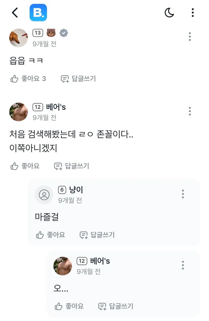 일상익명내가 한국인 관련으로 언젠가 터질 줄 알았음익명_989e0304약 5시간 전미친욘들이 검색방지도 안하고 야물딱지게 씹뜯하더니 ㅉㅉ카카오톡 연동해서 들어오면서 겁도 안나나봐난 쟤네가 고소 안당하는게 신기함찾아보면 이런글들 한두개가 아님 저 언급되신 분이 착하고 동질감 느껴서 보고도 모른 척 하면서 넘어가주는 거지제발 개념 좀 장착하고 살자1